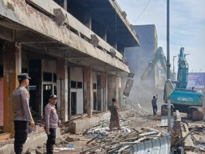 GarudaXpose.com, Pematangsiantar – Polres Pematangsiantar melalui persoil IPDA Revanto Barasa SH, AIPTU Edi Syahputra, AIPDA A. Sinulingga, AIPA Saut M. Tua Manurung dan BRIPKA Ricky Van Fauzy menggelar patroli kegiatan pembongkaran Gedung IV Pasar Horas, Jalan Merdeka, Kelurahan Dwikora, Kecamatan Siantar Barat Kota Pematangsiantar, pada Kamis 9 Oktober 2025 pagi pukul : 09.00 Wib.