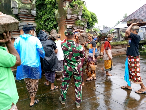 Bertempat di areal Pura Dalem Kauh Desa Adat Saba, aparat kewilayahan bersama sekitar 75 warga bahu membahu membersihkan puing – puing bangunan, memilah material yang masih dapat digunakan, serta merapikan lingkungan sekitar pura. Semangat kebersamaan dan kepedulian masyarakat terlihat jelas dalam upaya menjaga kesucian dan kelestarian tempat ibadah tersebut.