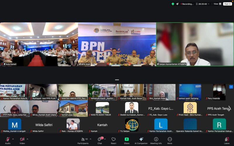 Garudaxpose.com, Jakarta – Sekretaris Jenderal Kementerian Agraria dan Tata Ruang/Badan Pertanahan Nasional (Sekjen ATR/BPN), Dalu Agung Darmawan, secara resmi membuka Rapat Kerja Daerah (Rakerda) Kantor Wilayah (Kanwil) BPN Provinsi Aceh yang dilaksanakan secara daring dan luring di Kanwil BPN Provinsi Aceh, Selasa (13/01/2026). Dalam arahannya, Sekjen ATR/BPN menegaskan perlunya evaluasi komprehensif terhadap pelaksanaan tugas dan program sepanjang tahun 2025, dengan penekanan bahwa capaian kinerja tidak boleh dipahami hanya dari sisi angka.