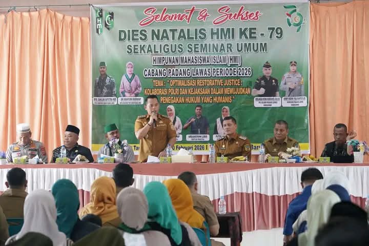 Garudaxpose.com | Padang Lawas – Bupati Padang Lawas Putra Mahkota Alam Hasibuan SE menghadiri acara peringatan Milad Himpunan Mahasiswa Islam (HMI) ke-79 tahun sekaligus Seminar Umum bertema “Penegakan Hukum di Kabupaten Padang Lawas” yang diselenggarakan untuk siswa-siswi SMKN 1 Barumun.selasa 10/2/2026