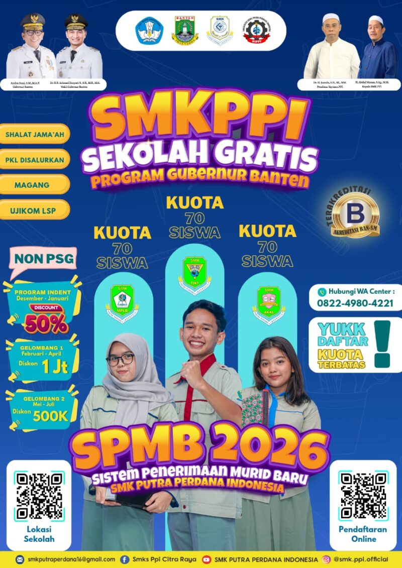 Garudaxpose.com | Kabupaten Tangerang – SMK Putra Perdana Indonesia (PPI) secara resmi membuka pendaftaran Sistem Penerimaan Murid Baru (SPMB) untuk tahun ajaran 2026/2027