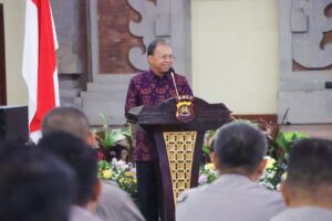 Untuk itu, Saya mengucapkan terimakasih kepada Bapak Kapolda Bali, atas acara pagi hari ini, kita harus mempunyai persepsi dan membangun kesadaran secara bersama – bersama guna mengatasi tantangan dan ancaman yang sedang dihadapi, agar Bali di mata dunia atau orang yang berkunjung ke Bali merasakan rasa aman dan nyaman, sekaligus memberikan kesejahteraan bagi masyarakat,” tegas Wayan Koster seraya mengajak Kapolda Bali beserta seluruh Kapolres/Kapolresta Kabupaten/Kota se-Bali bersama jajaran untuk menangani praktek wisman nakal, kasus narkoba hingga judi online di Bali.