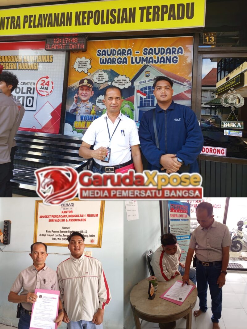 Laporan/pengaduan ADV.Suriyadi, S.H kuasa Hukum Hyang Bagus Maulana Arumifan di terima petugas SPKT Polres Lumajang, oleh SIUM, Ika Yuliana pangkat Pengatur, kesatuan Polres Lumajang pada, senin 8-12-2025, pukul. 12.12 WIB.