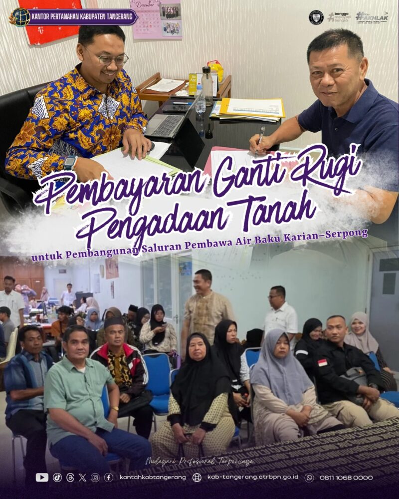 Garudaxpose.com, Kabupaten Tangerang, 09 April 2026 – Kantor Pertanahan Kabupaten Tangerang melaksanakan pembayaran uang ganti rugi dalam rangka pengadaan tanah untuk pembangunan Saluran Pembawa Air Baku Karian–Serpong (KSCS). Kegiatan ini merupakan bagian dari upaya pemerintah dalam mendukung percepatan pembangunan infrastruktur strategis nasional.