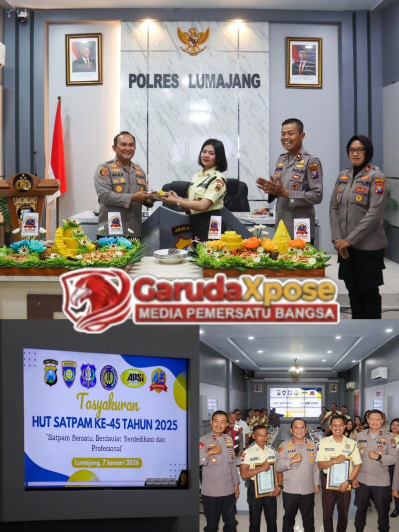 GarudaXpose.com I Lumajang – Kapolres Lumajang AKBP Alex Sandy Siregar, S.I.K., S.H., M.H. menghadiri kegiatan tasyakuran Hari Ulang Tahun (HUT) Satuan Pengamanan (Satpam) ke-45 Tahun 2025 yang digelar di Ruang Harmoni Polres Lumajang, Rabu (7/1/2026).