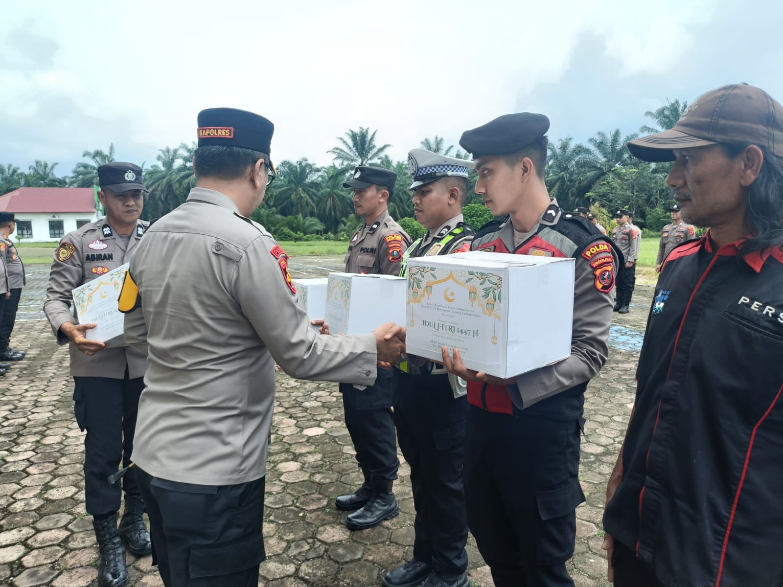 Padang lawas Garudaxpos com Kepala Kepolisian Resor Padang Lawas (Kapolres Palas) AKBP Dodik Yuliyanto, SIK., menyerahkan bingkisan lebaran kepada personel Polres Palas, seluruh Polsek jajaran, dan perwakilan awak media di Halaman Apel Mapolres Palas, Selasa 17 Maret 2026 Sanika Satyawada. Kegiatan ini merupakan bentuk kepedulian terhadap personel serta apresiasi kepada media sebagai mitra dalam menyebarkan informasi. Selain itu, Kapolres mengumumkan pelaksanaan Operasi Ketupat Toba 2026 yang akan berjalan hingga H+ Idul Fitri dengan sistem pelaporan melalui SOT dan live raport di lokasi keramaian.