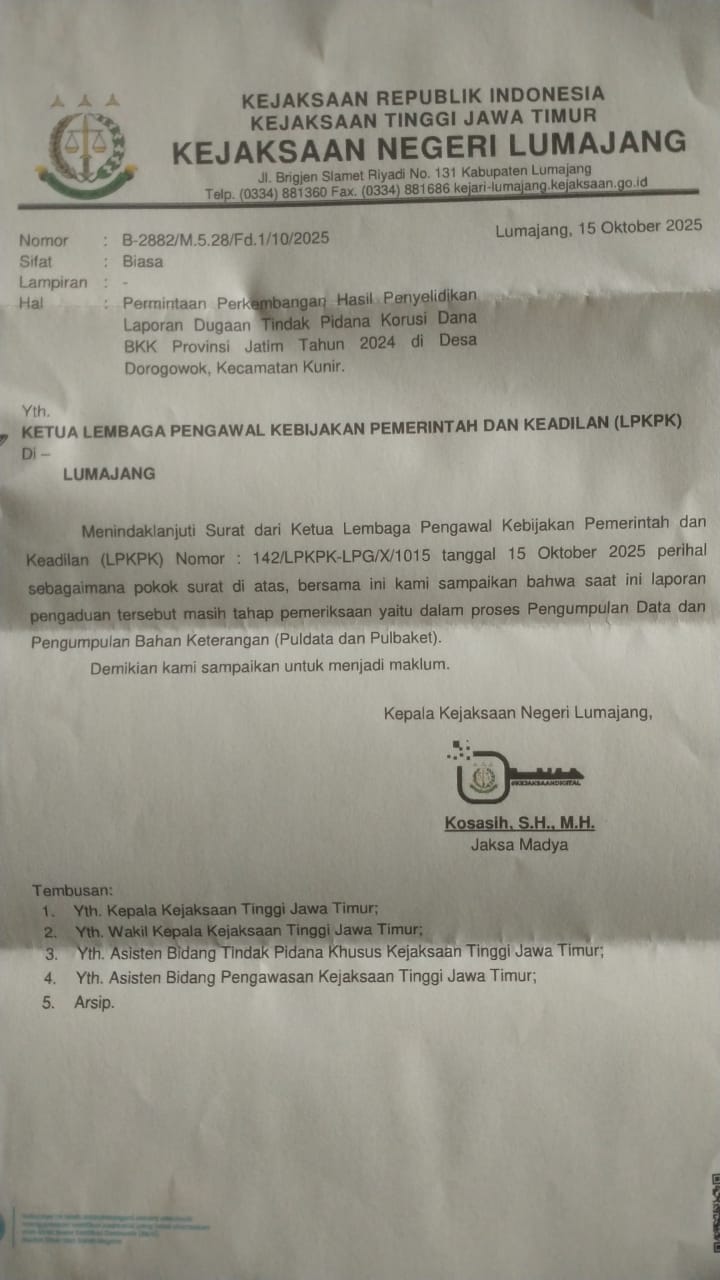 Dalam surat resmi bernomor B-2882/M.5.28/Fd.1/10/2025 tertanggal 15 Oktober 2025 yang ditandatangani langsung oleh Kepala Kejaksaan Negeri Lumajang, Kosasih, S.H., M.H., disebutkan bahwa laporan tersebut masih dalam tahap pemeriksaan awal, yakni proses pengumpulan data dan bahan keterangan (Puldata dan Pulbaket).