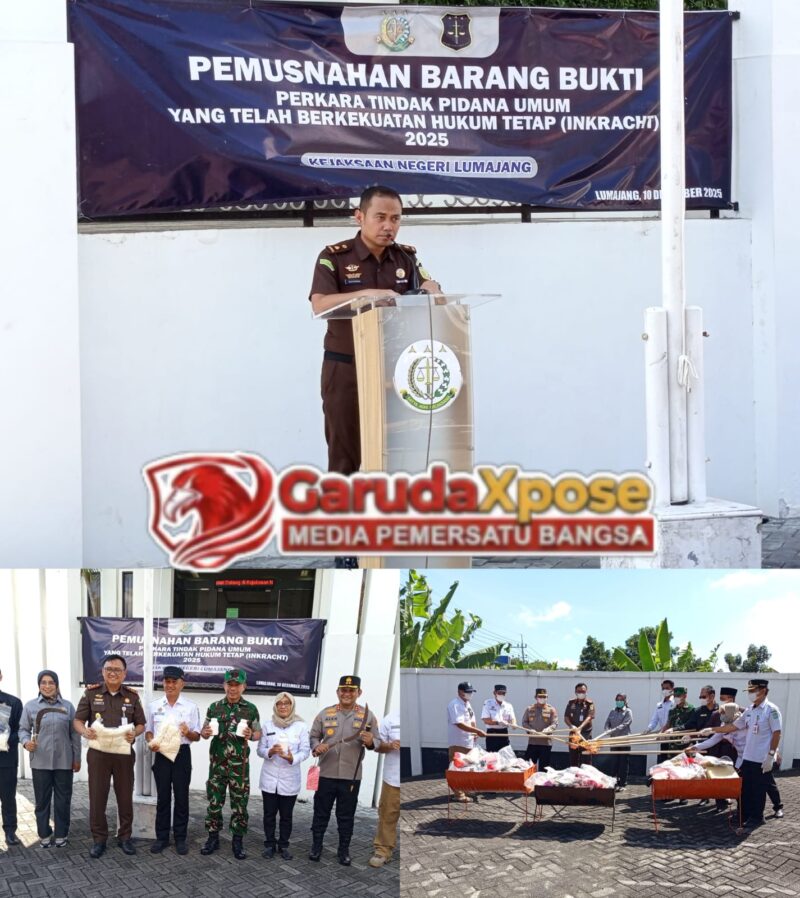 GarudaXpose. com I Lumajang – Kejaksaan Negeri Lumajang melaksanakan pemusnahan barang bukti dari 77 perkara pidana yang telah berkekuatan hukum tetap ( INCRACHT). Dalam pemusnahan barang bukti tersebut dilaksanakan di halaman kantor Kejaksaan Negeri Lumajang dan dipimpin langsung oleh Kajari Lumajang Ristu Darmawan, S.H., M.H, pada Rabo (10-12-2025), pukul 12.00 WIB.