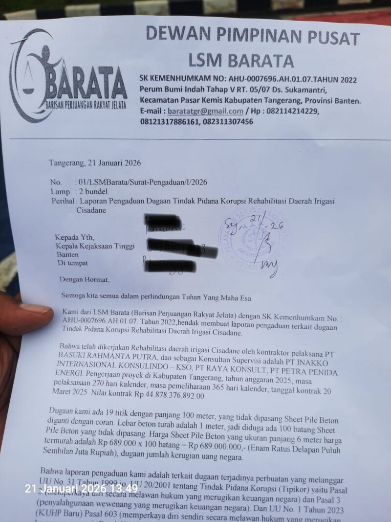 ” Kami melaporkan kepada Kejati Banten pada tanggal 21 Januari 2026, yang sampai sekarang sudah berjalan 4 bulan, dan surat pengaduan tersebut diterima oleh bidang Penkum, namun sampai saat ini belum ada tindak lanjut dari pihak Kejati,” ujarnya.
