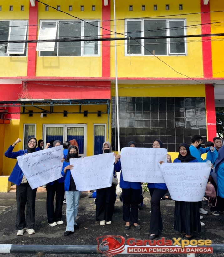 Mahasiswa juga menyoroti beberapa masalah lain, seperti penggembokan kampus dan pencopotan identitas kampus (STIE WIDYA MANGGALIA), hingga memaksa mahasiswa turun.