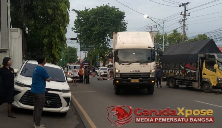 Karena jarak sudah dekat, motor korban tertabrak Truk hingga terjatuh ke badan jalan.