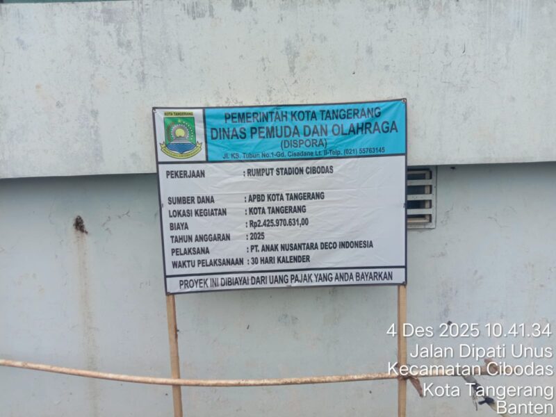Garudaxpose.com | Tangerang – Proyek pembangunan lapangan mini dikecamatan Cibodas,kota Tangerang tahap kedua,pemasangan rumput sintetis dengan anggaran Rp2.425.970.631,diketahui sebagai pelaksana proyek PT.Anak Nusantara Deco Indonesia.Pekerjaan ini memiliki masa pelaksanaan 30 hari.