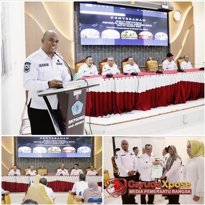 BREBES,GarudaXpose.com-Sebuah hari yang penuh makna terukir di Kabupaten Brebes. Rabu,25 Februari 2026, Aula Kartini Badan Kepegawaian dan Pengembangan Sumber Daya Manusia Daerah (BKPSDMD) menjadi saksi bisu penghormatan tulus Pemerintah Kabupaten Brebes kepada 33 Aparatur Sipil Negara (ASN) yang telah menunaikan baktinya dan kini memasuki gerbang purna tugas per 1 Maret 2026. Acara pelepasan yang dibingkai apik dengan Sosialisasi Pemberkasan Tunjangan Hari Tua (THT) dan Pensiun Pertama Ketaspenan ini, bukan sekadar seremonial belaka, melainkan sebuah simfoni apresiasi, renungan, dan doa bagi perjalanan hidup para abdi negara yang tak kenal lelah.