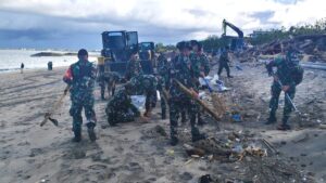 Garudaxpose.com ll Badung, Bali – Untuk mendukung program pemerintah Provinsi Bali terkait penanganan sampah laut, dilakukan kegiatan karya bhakti terpadu Kodim 1611/Badung dan personel Yonif 741/Garuda Nusantara di Pantai Jerman, Kelurahan Kuta, Kecamatan Kuta, Kabupaten Badung. Kegiatan ini bertujuan membersihkan kawasan pesisir dari berbagai jenis sampah yang mengganggu keindahan pantai dan ekosistem laut.