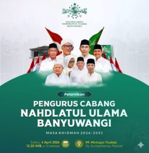 Garudaxpose.com |BANYUWANGI, Pengurus Cabang Nahdlatul Ulama (PCNU) Kabupaten Banyuwangi masa khidmat 2026–2031 resmi dilantik pada Sabtu, 4 April 2026 di Ponpes Minhajut Thullab Desa Sumberberas, Muncar. Pelantikan yang dimulai sejak pukul 12.30 WIB ini akan menjadi momentum penting dalam melanjutkan estafet kepemimpinan organisasi keagamaan terbesar di daerah tersebut.