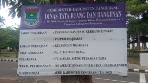 GarudaXpose.com | Kabupaten Tangerang – Kegiatan Dinas Tata Ruang Dan Bangunan Kabupaten Tangerang sekilas hampir rampung pengerjaannya, kegiatan yang berjudul. Pembangunan Pintu Gerbang Lingkup Puspem Tigaraksa, yang menelan anggaran sebesar Rp. 2.447.938.318.16; Pelaksana kegiatan PT SAGARA AGUNG PERSADA UTAMA, waktu pelaksanaan 165 hari kalender, bersumber dana dari APBD Kabupaten Tangerang T.A. 2025.