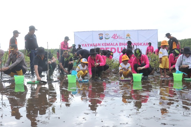 Rangkaian kegiatan dimulai sejak pagi hari dengan doa bersama, dilanjutkan penyerahan bantuan oleh Bhayangkari, hingga puncaknya penanaman bibit mangrove secara bersama-sama oleh seluruh peserta yang hadir.