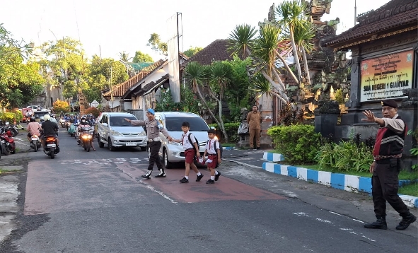 Garudaxpose.com | Bali – Personel Polsek Gianyar melaksanakan kegiatan pengaturan arus lalu lintas (pos pagi) di depan SD Negeri 2 Gianyar, Jalan Ratna Desa Tegal Tugu Kecamatan Gianyar pada Senin 30 Maret 2026 pagi. Kehadiran polisi di jam – jam sibuk tersebut bertujuan untuk memberikan rasa aman dan nyaman bagi masyarakat, khususnya para pelajar yang memulai aktivitas sekolah.