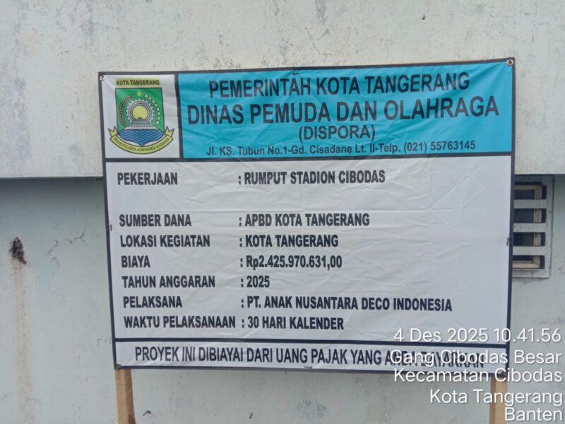 Garudaxpose.com | Tangerang – Proyek lapangan mini di Kelurahan Cibodas,kecamatan Cibodas, kota Tangerang yang dilakukan Dinas Pemuda dan Olahraga (Dispora) tahap kedua, pemasangan rumput sintetis dengan anggaran Rp. 2.425.970.631, diketahui sebagai pelaksana proyek PT.Anak Nusantara Deco Indonesia.