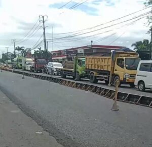 3. *Dampak*: Terjadi antrean panjang kendaraan roda dua, roda empat, hingga truk. Lalu lintas hanya dapat melintas satu jalur secara bergantian.