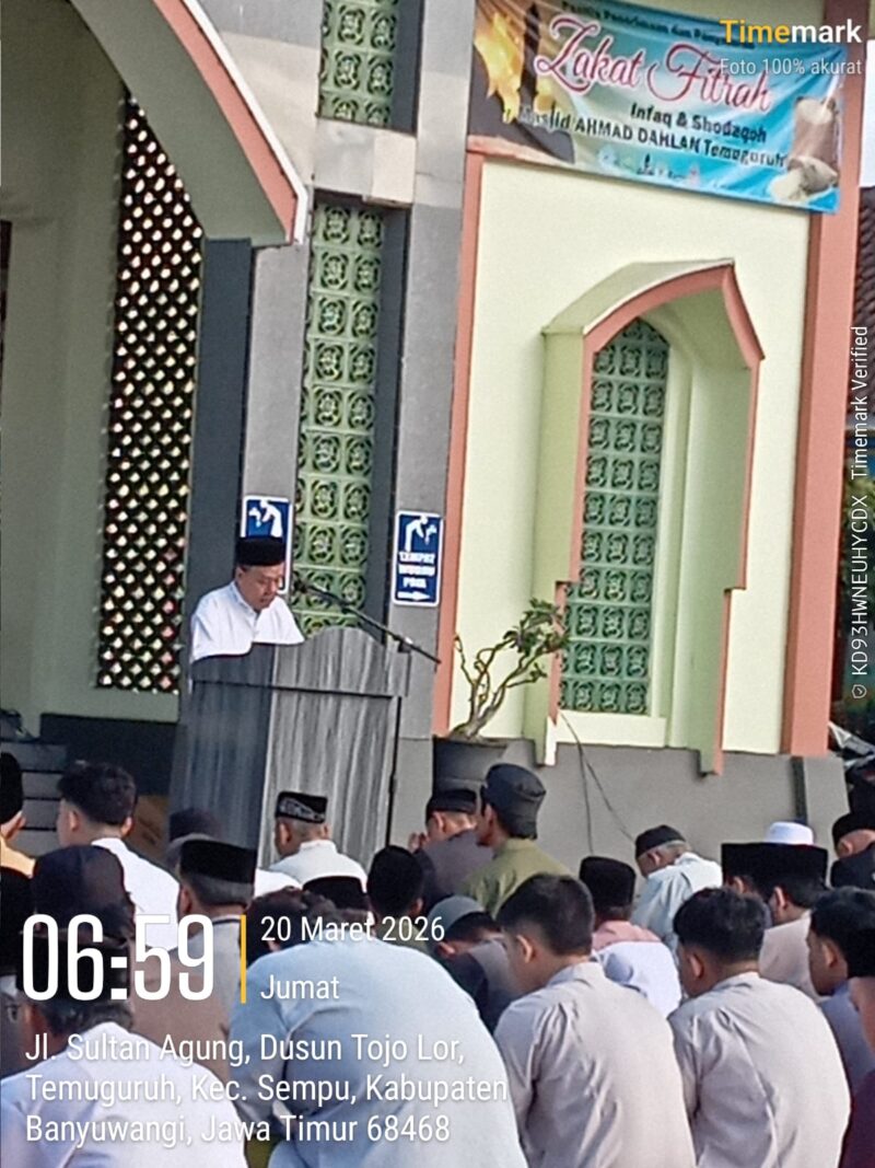 GarudaXpose.com |BANYUWANGI – Pelaksanaan Salat Idul Fitri 1447 Hijriah berlangsung khidmat di wilayah Dusun Tojo Lor, Jalan Sultan Agung, Desa Temuguruh, Kecamatan Sempu, Jumat (20/3/2026) pagi.