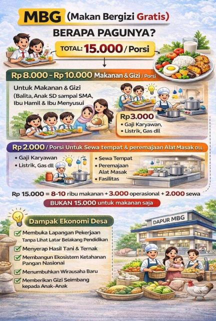 Lebih lanjut dijelaskan, anggaran MBG juga mencakup biaya operasional sebesar Rp3.000 per porsi. Dana tersebut digunakan untuk kebutuhan pendukung seperti pembayaran listrik, internet dan telepon, gas, air, insentif relawan Satuan Pelayanan Pemenuhan Gizi (SPPG), insentif guru PIC, insentif kendaraan, pembayaran BPJS Ketenagakerjaan relawan, insentif kader posyandu untuk distribusi 3B, pembelian alat pelindung diri dan perlengkapan kebersihan, BBM mobil operasional MBG, hingga operasional Kepala SPPG beserta tim.