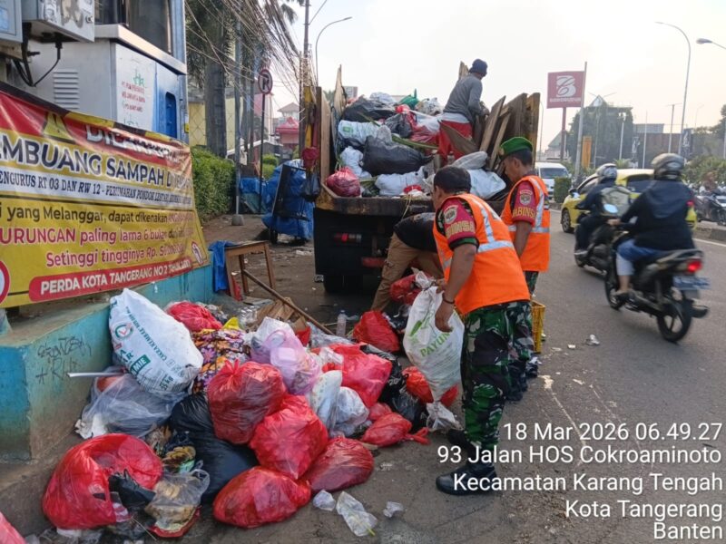 Garudaxpose.com, Tangerang – Menjelang hari raya Idul Fitri 1447 H Tahun 2026 M. Satgas sampah Koramil 04 Ciledug, Kodim 0506/Tgr membersihkan tumpukan sampah di CBD Maal Jalan Hoscokrominoto Kelurahan Karang Tengah, Kecamatan Karang Tengah Kota Tangerang, Rabu (18/03/2026).