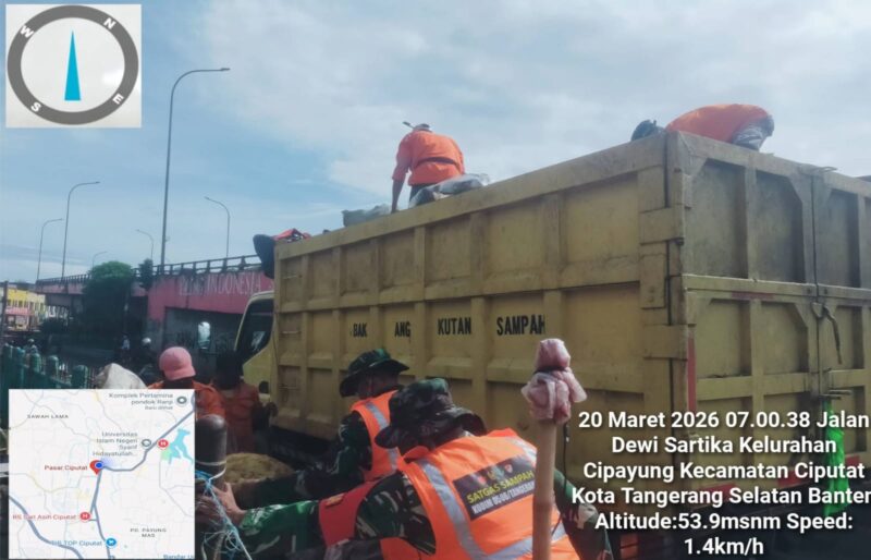 Garudaxpose.com, Tangerang – Menjelang hari raya Idul Fitri 1447 H Tahun 2026 M. Satgas sampah Koramil 05/Ciputat Kodim 0506/Tgr membersihkan lingkungan pasar Ciputat, Kelurahan Cipayung, Kecamatan Ciputat, Kota Tangsel, Jumat (20/03/2026).