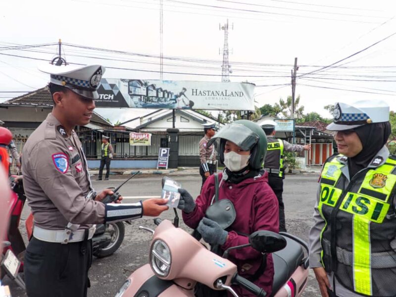 Kali ini, petugas Satlantas membagikan brosur himbauan kepada para pengendara yang melintas di Jalan Raya Panjaitan, Kelurahan Citrodiwangsan, Kecamatan Lumajang, Kamis (6/11/2025).