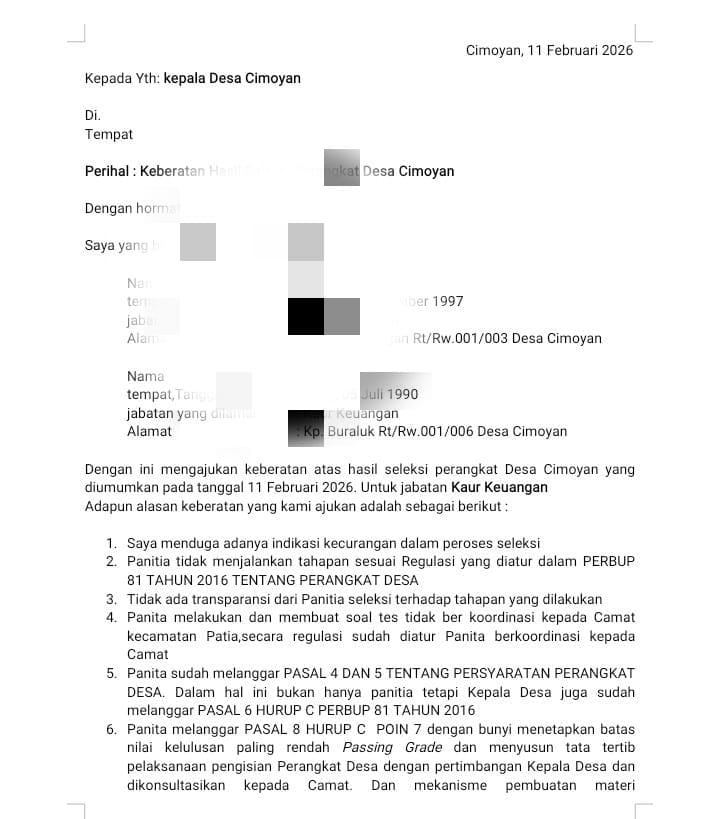 Kepada media dua peserta inisial JI dan ON secara resmi menyampaikan surat keberatan kepada Kepala Desa Cimoyan atas hasil seleksi yang diumumkan pada 11 Februari 2026. Keduanya mempertanyakan proses yang dinilai tidak sepenuhnya selaras dengan ketentuan dalam Peraturan Bupati Pandeglang Nomor 81 Tahun 2016 tentang Perangkat Desa.