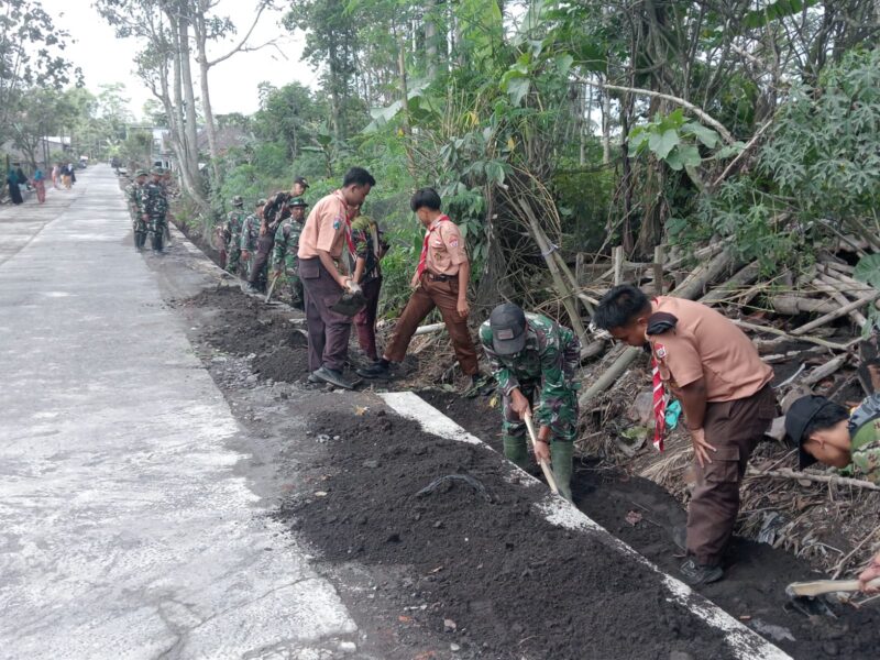 Semangat gotong royong terlihat kuat, terutama dari para anggota Pramuka yang turut bekerja membersihkan endapan material dengan peralatan manual.