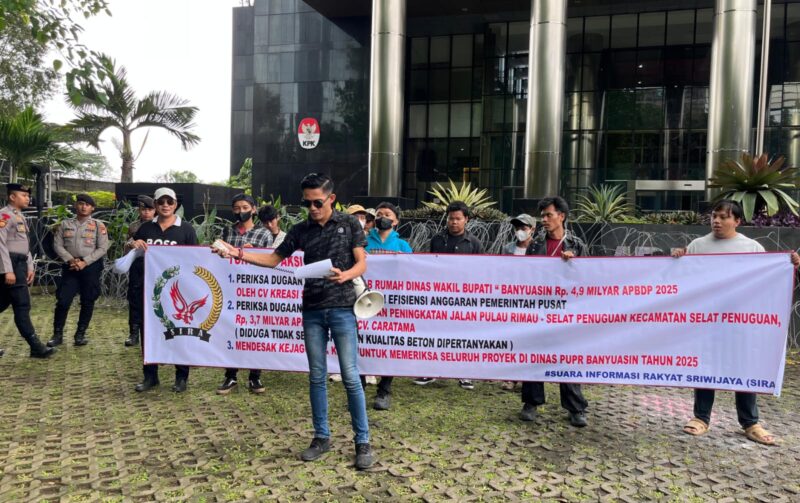 Garudaxpose.com | Jakarta, – Selasa, 27 Januari 2026, Suara Informasi Rakyat Sriwijaya (SIRA) mendatangi gedung merah putih KPK RI untuk melakukan aksi damai dengan bertujuan menyampaikan dukungan kepada lembaga anti rasuah ini segera turun ke Kabupaten Banyuasin Prov. Sumsel, bahwa banyak permasalahan pelaksanaan pekerjaan proyek-proyek khususnya pada Dinas PUPR Kab. Banyuasin TA. 2025 yang diduga kuat bermasalah dan berpotensi merugikan keuangan Negara.