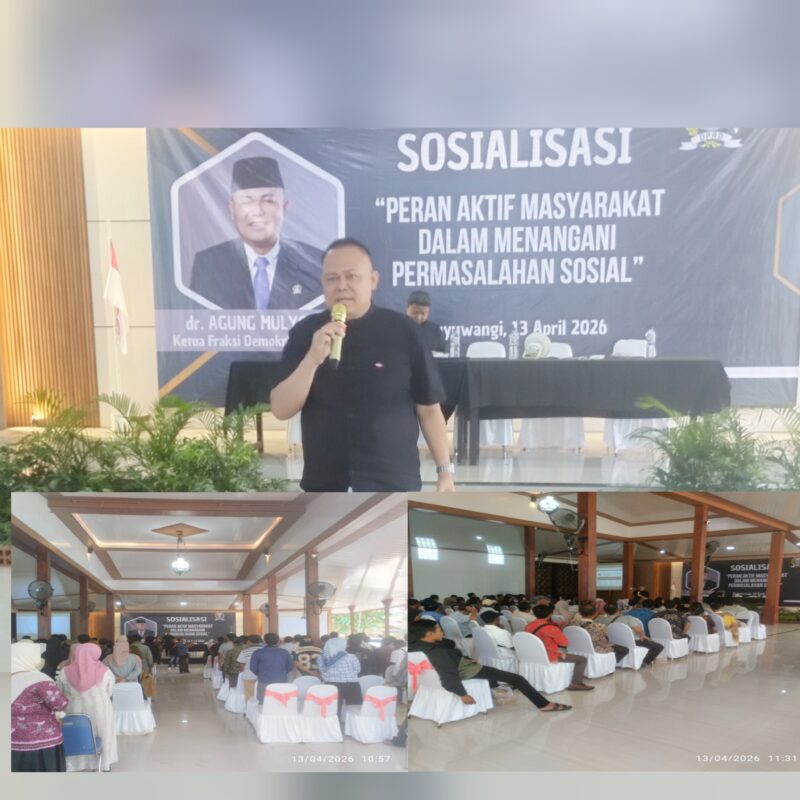 Garudaxpose.com|Banyuwangi- Kegiatan sosialisasi bertajuk “Peran Aktif Masyarakat dalam Menangani Permasalahan Sosial” sukses digelar di Banyuwangi, Senin (13/4/2026), dengan menghadirkan Ketua Fraksi Demokrat DPRD Jawa Timur, Agung Mulyono, sebagai narasumber utama. Acara ini dihadiri oleh berbagai elemen masyarakat, tokoh pemuda, organisasi kemasyarakatan, serta warga yang antusias mengikuti jalannya kegiatan.