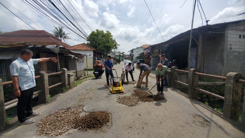 Jajaran Pemdes turun langsung melakukan perbaikan jalan berlubang yang berlokasi tepat di depan Kantor Desa Talagasari.