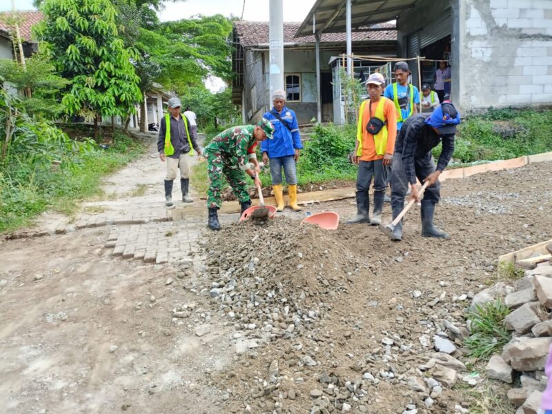 Garudaxoose.com, Kabupaten Tangerang – Upaya meningkatkan perekonomian desa, Babinsa Desa Taban, Koramil 06/Trs, Kodim 0510/Trs Kopda M Andriyanto gotong royong bersama warga masyarakat memperbaiki jalan yang akan di cor.