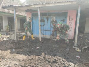 Sejak pagi, Serda Heru dan tim lainya bergerak menyisir rumah warga yang masih dipenuhi pasir, material keras, serta lumpur sisa lahar dingin.