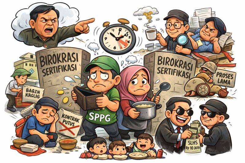 Namun realita di lapangan menunjukkan ironi. para pekerja Satuan Pelayanan Pemenuhan Gizi (SPPG) mengeluhkan panjang dan berbelitnya proses pemenuhan persyaratan Safety, Health, and Environment (SHE/SLHS) yang menjadi syarat mutlak operasional. Alih-alih mempercepat layanan gizi, proses administratif justru menjadi penghambat utama.